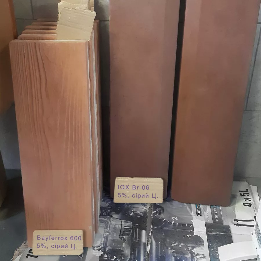 Барвник залізоокисний Bayferrox 600: суміш заліза: (Fe2O3, Fe3O4, FeOOH). Колір світлий коричневий з помаранчевим відтінком: карамельний, теракотовий. Самий світлий коричневий колір Bayferrox. Ефективно працює як з сірим так і з білим цементом.